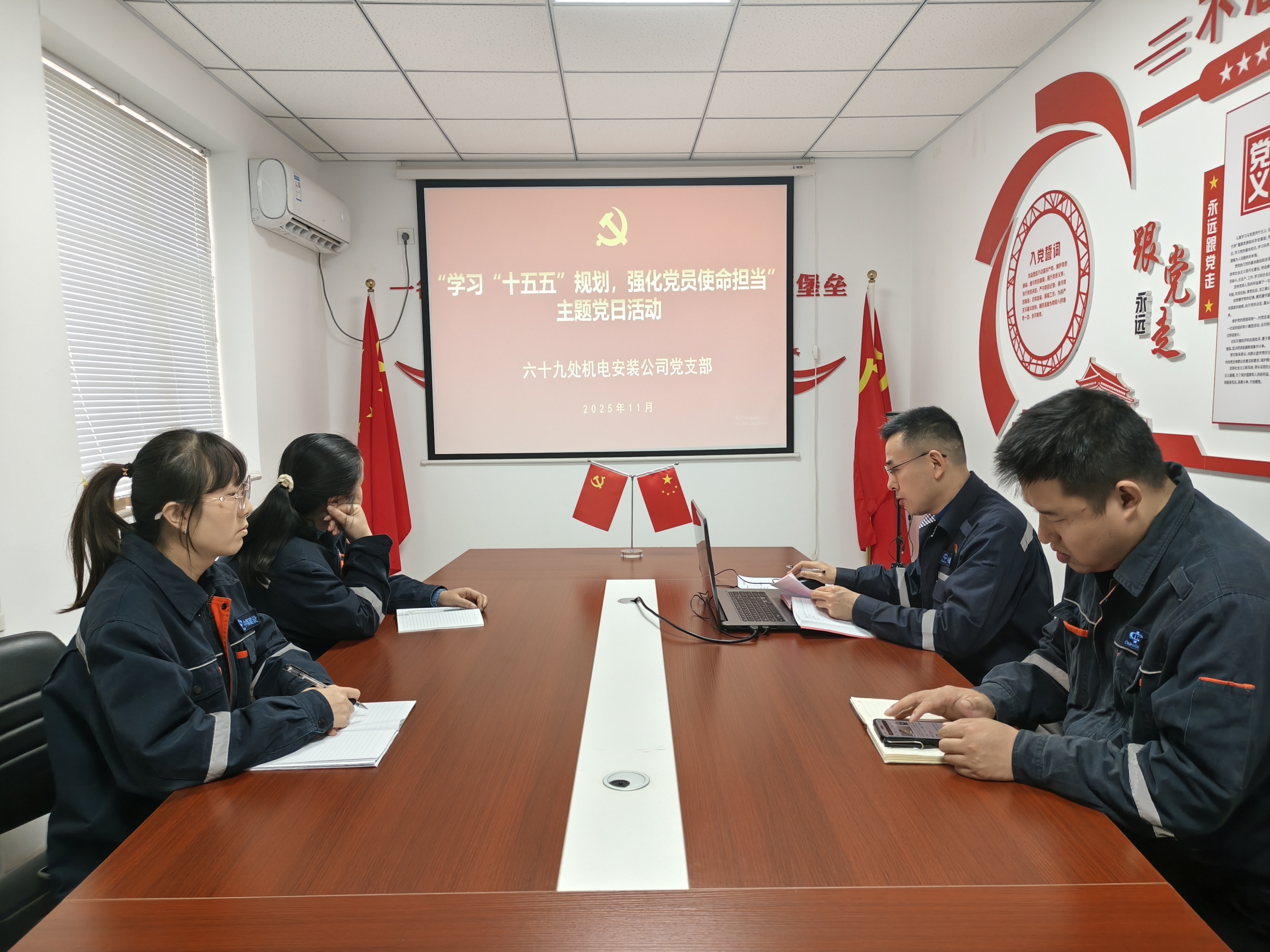 活动首先组织大家深入学习《中共中央关于制定国民经济和社会发展第十五个五年规划的建议》及习近平总书记关于《中共中央关于制定国民经济和社会发展第十五个五年规划的建议》的说明。随后,支部书记系统解读党的二十大报告的核心要义和精神实质。10余名党员及积极分子齐聚一堂,结合机电安装工作实际,就如何践行初心使命、提升服务质量展开热烈讨论。大家一致表示,要以实际行动推动公司高质量发展,为行业创新注入红色动能。最后支部认真组织学习《关于转发〈国务院国资委党委关于追授黄启东同志“中央企业优秀共产党员”称号的决定〉的通知》。通过对黄启东同志先进事迹的学习,项目部党员经历了一次深刻的精神洗礼。这项学习激发了大家对标先进、学习先进的良好氛围。