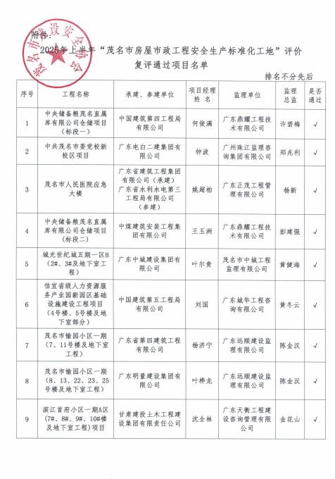 近日,茂名市住房和城乡建设局公布2025年上半年“茂名市房屋市政工程安全生产标准化工地”评选结果,六十九处承建的中储粮茂名仓储项目,凭借卓越的安全生产管理能力、规范化的现场管理以及创新的安全技术应用,从众多参评项目中脱颖而出,成功获评这一荣誉,为茂名市建筑行业安全生产标准化建设树立了新标杆。