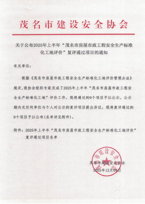 此次荣获“茂名市房屋市政工程安全生产标准化工地”称号,是对茂名项目部安全生产管理工作的高度认可与肯定。茂名项目部将以此次荣誉为新的起点,不断探索创新安全管理方法与模式,持续提升安全生产管理水平,进一步提升企业品牌形。(王玉龙 刘富云)